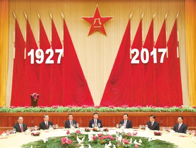 人民大会堂宴会厅灯火辉煌,洋溢着节日的喜庆气氛。主席台帷幕中央悬挂着巨型“八一”军徽,两旁是十面鲜艳的红旗。“1927—2017”几个醒目的大字,昭示着中国人民解放军走过了90年的光辉历程。18时许,在欢快的《迎宾曲》乐曲声中,习近平等党和国家领导人步入宴会大厅,同1800余名中外来宾欢聚一堂。