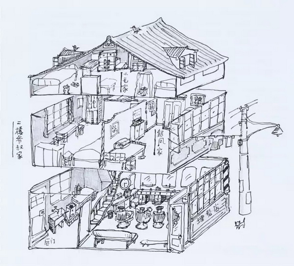 金:纯粹是个人的兴趣,以前只是注意插图,喜欢看插图,偶然会画下一个印象,没有画插图的兴趣。为《繁花》插图的原因,我只是想补充文字表现的不足——有时我即使写了两万字,也难表现一幢建筑的内部细节,图画是可以的。
