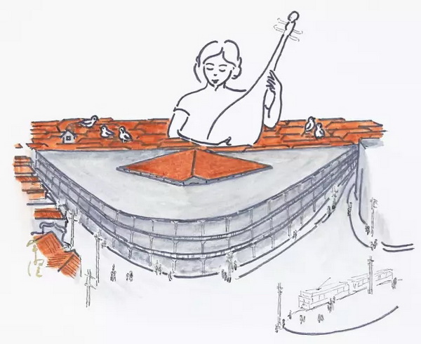 典型上海老弄堂,无天井,无抽水马桶,曾是周璇、赵丹说笑,挂鸟笼的布景。1990年发明了新式马桶,底部有粉碎器,一切可以打碎,冲入下水管道,重点销售对象,就是这类民居的人们。 ——《繁花》插画