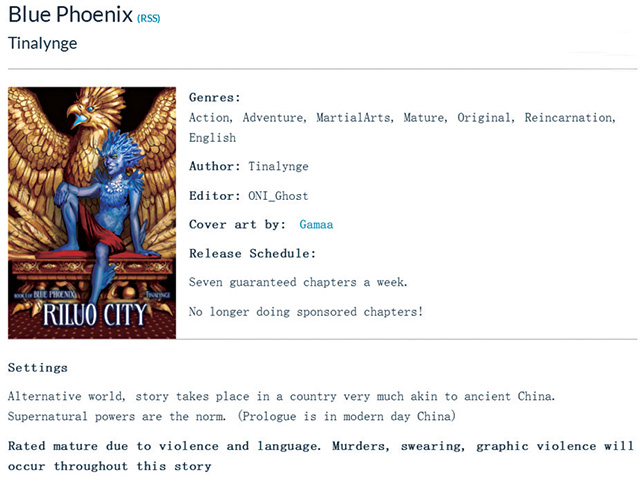 Goodguyperson:Gravity Tales上的原创英文网络小说现在有7部,作者有6位,里面有一位作者写了两部。7部作品里有一部《蓝凤凰》(Blue Phoenix)的作者是个荷兰姑娘,她的书不但在亚马逊上卖得不错,在荷兰当地也有出版商看中,听说已经要出实体书了。