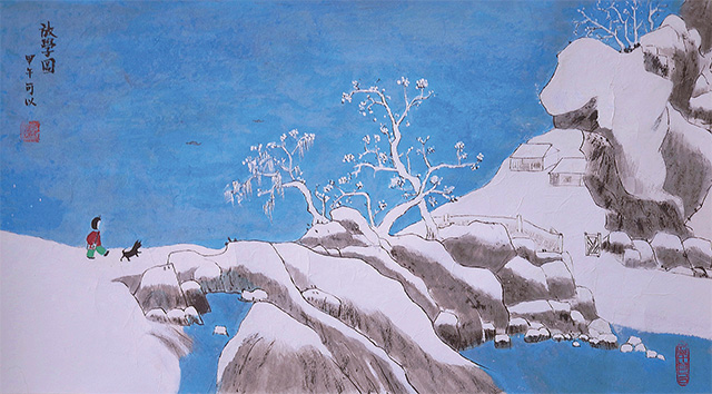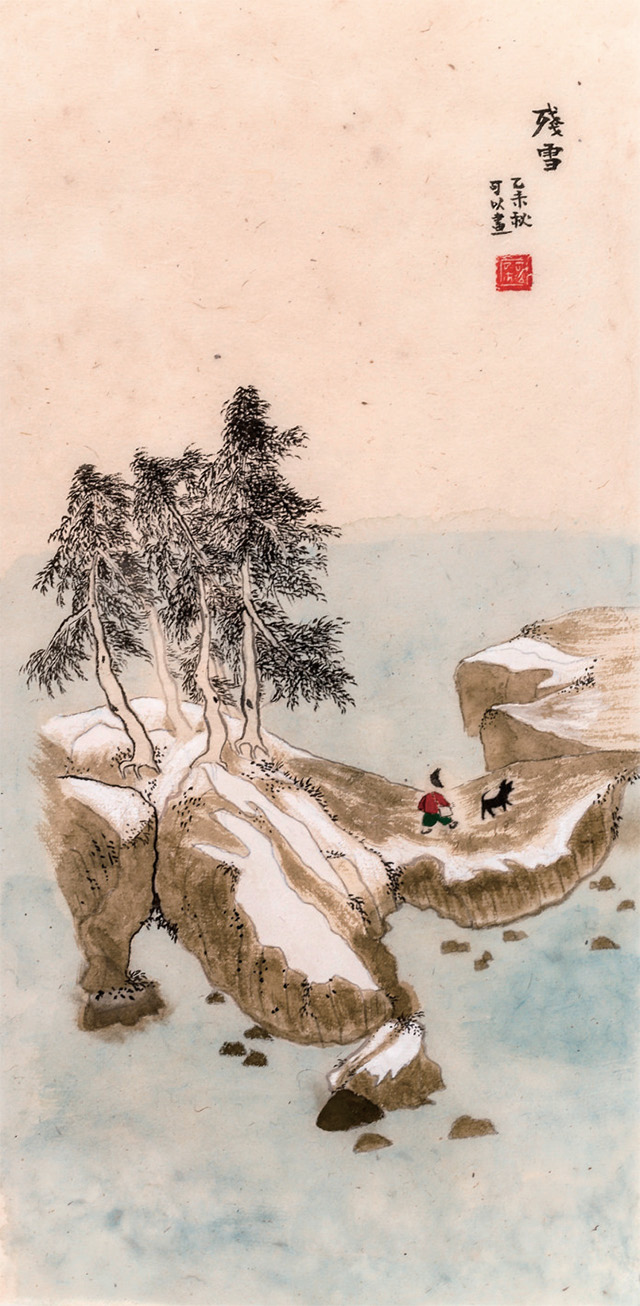 2013年的某天饭后,试用余墨涂鸦,突然上了瘾,画了上百幅小画,绘出记忆中红衣绿裤的孤独童年与美丽故乡,到小画成书,翻阅时依旧忧伤,且温情荡漾。知晓自己无绘画基础,那么多人欢喜小画的稚拙天真,心里很惭愧,打算接下来花工夫临摹清末画谱《芥子园画谱》或名人水墨,掌握画山水树木花鸟虫鱼的基本技巧,以便新作经得起细致观赏。有人说没必要那么做,保持天然野生,无根无派的很好。这使我想起另一种观点,意思是大学教育没用,千万不要去上大学。这观点我不太赞同,社会里坏且复杂,那就不要到社会去了。我们身在某处,不是单纯地、被动地接受教育,更潜在的是,在过程中发现自我、形成自我、证实自我,一个人的成形,取决于自己的底色,你是自己的主干。一棵冬天里落满雪的树,根茎仍然在土地里生长,汁液依旧流淌,若不是毁灭性的破坏,它总是按自己的样子成长。当然只是打个比方。在漫长的被教育过程中,始终有一个自我的核仁,这颗核仁要么自我分解、要么被敲碎,要么长得坚不可摧。硬核,也就是人格与思考的独立部分,敏锐,智慧,这一部分将是卡住小齿轮的石子。