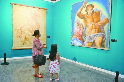 8月20日,正在鸟巢文化中心展览的“米开朗基罗国际艺术展”展厅里,人们在静静观赏。被誉为“文艺复兴三杰”之一的大师有着不言自明的号召力,吸引来不少观众,有三五成群的年轻人、结伴而来的情侣,也有带着孩子的父母。