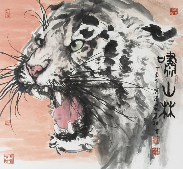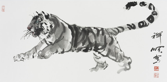 笔会现场,中俄两国艺术家挥毫泼墨,用手中之笔切磋技艺,展示各自的艺术特色。孟祥顺龙飞凤舞般地将一只飞奔的写意虎展现在大家面前,发光的双眸、胜利旗帜般竖起的虎尾,寥寥几笔、动态尽显,震煞旁人。除了画虎,他的书法造诣也颇深,抬笔落笔间尽显大家风范。