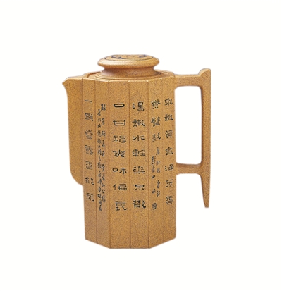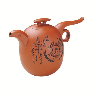 宜兴市,古称“荆邑”、“阳羡”,是中国著名陶都。宜兴素有“陶的古都,洞的世界,茶的绿洲,竹的海洋”之称。尤其是“荆溪十景”,自古以来,就吸引无数文人墨客在那里留下了赞美的诗篇。对于喜爱传统文化的鲍志强来说,他用创新的手法将这些诗文、风景画与紫砂结合在一起,产生了一个新的系列——“荆溪十景”。这一系列作品中的紫砂壶,壶身比传统的形制大一些,近看会发现有诗文题字,旁边又有山水画,印象深刻。