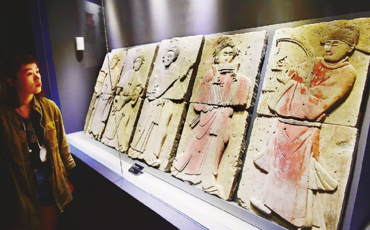 “留住色彩——陶质彩绘文物保护成果展”日前在西安秦始皇帝陵博物院开展。展览展出了从先秦至元代的陶质彩绘文物121件(组)及非文物类展品,对陶质彩绘文物保护修复的相关原则、程序、基本技术知识等进行展示。图为观众在展览上参观五代“彩绘浮雕砖” 。