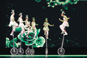 杂技《高车踢碗》展现了演员高超的平衡、踢碗等技艺。