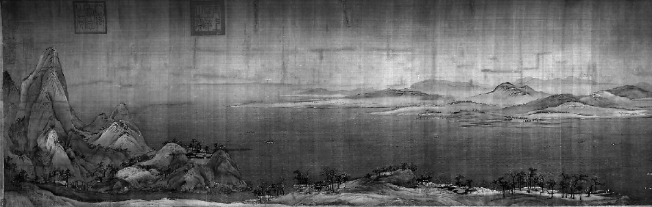 画中一座座突兀的高山大岭伫立在大江大湖边,山势雄秀,群峰簇拥主峰,据考证,类似这样的地质地貌,极可能是赣北鄱阳湖与庐山。全图系传统的散点透视,群山均非概念化的排列,经过总体把握和周密布局,由七大组群山组成,像是某个具体地域的山势作横向展开,重现七次,每组都将主峰和诸多辅峰组合起来,如同一座座山岛矗立在江边湖畔,形成互有联系的“岛链”。这种观察、组合群山的方式与画家在江南的生活体验有关。卷首第一组为序曲,该组和第二组之间以小桥相接,第三组和第四组之间以长桥相连,最高的主峰似庐山汉阳峰在第五组,拔地而起,成全卷的高潮。最后一组如同音乐的尾声,节奏感十分鲜明。每一组群山不是作简单循环,都出现了许多新的变化,如变换山体造型、增换瀑布和溪流以及建筑群,如同乐曲中的“变奏”。