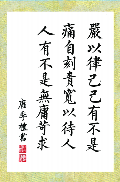 唐季礼说, 现在回想起来,那时虽每天研习,但年纪小,见识与经历有限,其实仍懵懵懂懂,没真正明白父亲说的那些书法与做人间的道理。多年后,研习书法已成为他劳顿后放空自己,放松身心与自己的心灵进行对话的最好方式。在一横一竖、一撇一捺、一黑一白中,他渐渐参悟了父亲的那些话。他开始在书法的工整与自然中,注意正欹朽生,错综变化,或者于平正中见险绝,险绝中求趣味……这些艺术观念,同样渗透在他的电影之中。