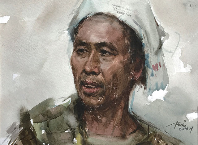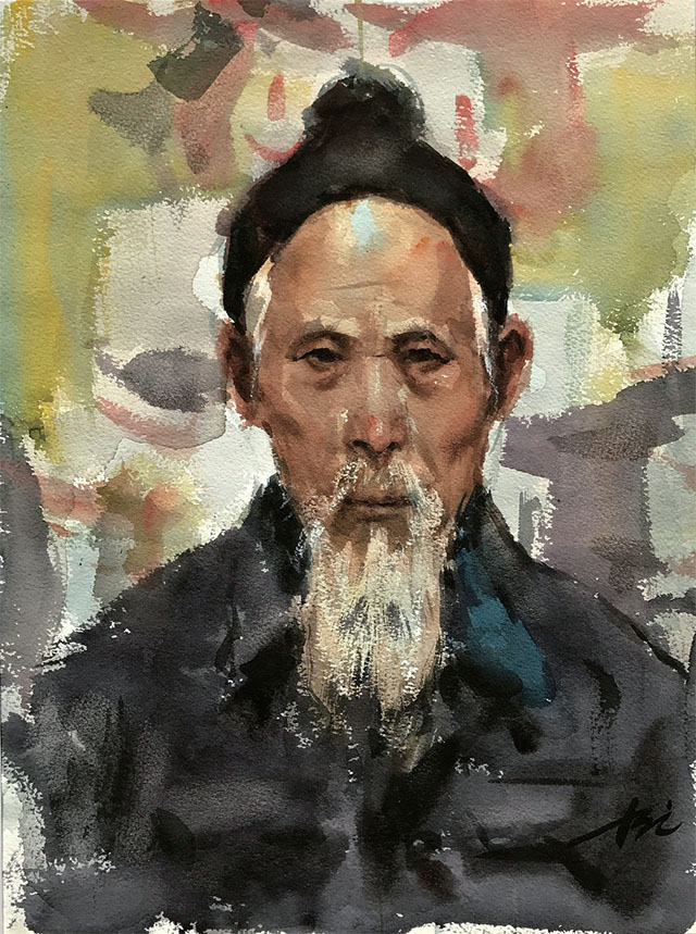 不无遗憾的是,他长期在湖南,我在北京,一起作画的机会不多。2008年,云南泸沽湖的的摩梭族出了一位任职边防部队的高级指挥员,族人称他“何司令”,他发起邀请全国知名画家到泸沽湖画“女儿国”生活,我特别向他推荐贺安成参加。他到的当天即给“何司令”画了一张水彩像,画得真是惟妙惟肖。因为画得太好了,当晚这张画即被某位懂眼人偷走,令“何司令”懊恼不已。那次他还画了许多摩梭少女和老奶奶的肖像,都画得生动自然,用笔精准,水彩意味浓厚,这种本事显然不是三天两天练得出来的。他画过很多大幅创作,但他显然也一直心仪于水彩或油画的人物肖像,如杜甫《丹青引》诗中所说“必逢佳士亦写真”和“屡貌寻常过路人”,他有机会就画,一生不知画了多少写生佳作。