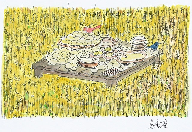 再来一次竞赛会怎样?麦地里的板桌,迈开四条腿,像马匹一样渐渐朝这里走来…… (出自《方岛》)