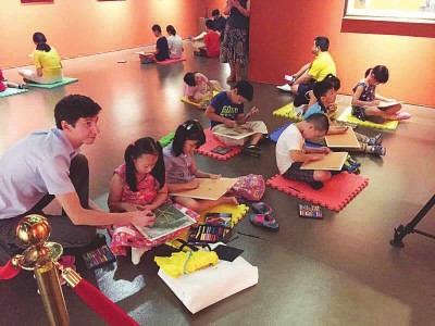 孩子们席地而坐,对着墙壁上的艺术作品静静临摹,是中华艺术宫常见的一幕。(均中华艺术宫供图)