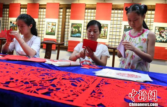 参展剪纸艺术家、福建省剪纸专委会副秘书长,福州市剪纸学会副会长董亚萍(图中)及其学生进行现场剪纸展演。 记者刘可耕 摄
