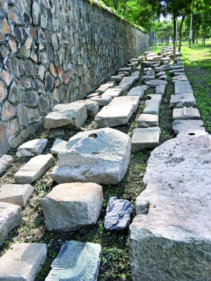 在紧挨南墙的墙根下,绵延20多米的虎皮石、石构件、城砖等文物,“筑”成了一道壮观的“文物长城”(右图)。“随着圆明园周边区域的搬迁腾退,我们从2015年开始专门成立了文物回收工作组,目前已经从圆明园周边地区收回8万余件文物,一块砖、一方条石、一件柱础就算一件文物。”圆明园管理处文物考古科科长陈辉告诉北京晨报记者。
