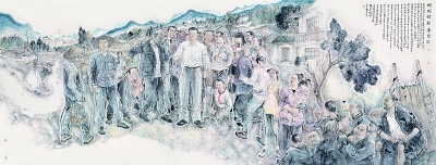 四川省宜宾市筠连县腾达镇春风村党支部书记王家元为了此次展览连夜赶到北京,看到作品中的自己,他有些不好意思。“未来我们要发展乡村生态旅游,让山更绿,水更清,村更美,人更和谐。”王家元带领春风村干部群众,迎难而上、创新巧干,开凿出山公路,发展特色产业,把石漠化严重、自然条件恶劣的“石山村”,变成了花果飘香的“世外桃源”,发展成全省富裕文明的新农村,创造了脱贫致富的独特发展模式。作品《春风村的领路人——王家元》中,这位带领大家致富的“带头人”与村民围坐在一起,周围群山环抱、繁花盛开,呈现出春风吹拂下的勃勃生机。来自中央美术学院的刘庆和教授说,王家元在基层工作的实干担当和身上充满的正能量深深打动了他,刻画这样的人物,他的笔墨间充满着感情。
