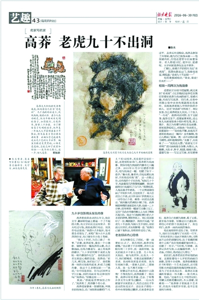10月6日,俄语翻译界的泰斗,《保尔·柯察金》、《安魂曲》的译者,91岁的著名作家、画家高莽先生逝世。今年1月12日,高莽先生还为本报留下绝笔——缅怀著名舞蹈家贾作光先生的整版悼文《大雁飞向远方》,为读者留下向真、向善、向美的精神力量。因为夫妇都属虎,高莽戏称自己的家是“老虎洞”。去年4月,本版编辑随著名作家、画家鲁光先生走进“老虎洞”。高莽老为好友鲁光画像,鲁光为高莽赋诗,谈笑风生、智慧风趣。这难忘的相聚,被鲁光先生写进《高莽 老虎九十不出洞》,刊发于去年6月30日的《北京晚报》。不料,这一面,也成为他们的永别。10月7日,噩耗传来,鲁光先生熬通宵写成此文,为老友高莽送行。