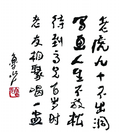 头一回拜访,我为他写了一篇短文《红色汉子高莽》。过了几年,高莽搬到了农光里小区。因为高莽夫妇都属虎,高莽戏称自己的家为“老虎洞”。画友古干用现代书法题写了“老虎洞”三个字,他挂在客厅门楣上方。两家住得近了,我去得就勤了,有时半个月就光顾两三回。每次去访,高莽都为我画像。他长我十岁,学问更在我之上,但每次在画上都会写些如“牛哥”、“鲁光兄”之类的谦逊之词。