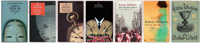 左起:《远山淡影》英文版、《浮世画家》英文版、《长日留痕》英文版、《无可慰藉》英文版、《上海孤儿》英文版、《别让我走》英文版、《被掩埋的巨人》英文版