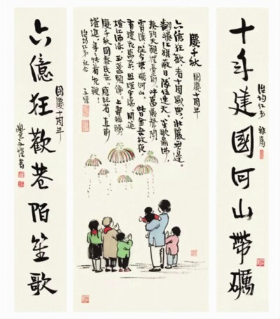 前不久沪上举行的一次拍卖会上,丰子恺书画作品 《庆千秋》 和 《行书八言》 联袂亮相,唤起人们很多温暖记忆。绘画 《庆千秋》,寥寥数笔描绘出大人孩子观赏烟花时其乐融融的场景。这是丰子恺在新中国成立以后的代表作,随画面溢出的不仅是温暖和幸福,还有无限的希望。人们不难感受到,他的漫笔抒情画随新时代而得到重生。当时,丰子恺已举家迁入上海陕西南路39弄93号的“日月楼”,安居乐业,阖家幸福,踌躇满志。生活状况的稳定,让曾经饱受战争流离、饥饿病困的他感到“温暖和平而幸福”,兴奋与感动之情溢于笔墨之间。