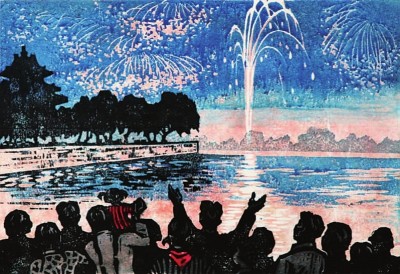聚焦观赏烟花,“新兴木刻运动”先驱之一的李桦也曾留下作品,那是以套色版画形式创作的 《国庆之夜》。远处,一簇簇烟火冲上云霄,如花瓣般缤纷四落;近处,是观赏的人们一字排开的背影,其中一位张开双臂的男子与一个坐在大人肩头的孩童都是点睛之笔。人群与烟花之间,隔着波光粼粼的湖水,最是让这幅画从一众描绘国庆观赏烟花的美术作品中脱颖而出,只见宁静与祥和从一派热闹的氛围中透出。