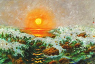 名为 《祖国颂》 的美术作品,至少有一幅国画与一幅油画堪称经典。其中,经典国画《祖国颂》 出自齐白石,既能代表艺术家大写意花鸟的最高水平,也算得上新中国红色经典艺术的开山作之一。1954年创作这幅作品时,白石老人已逾90岁高龄。高2.18米、宽0.725米的巨幅画作中,所绘内容有着艺术家一以贯之的简洁,只有一株松柏、一轮红日、一只仙鹤、一汪湖水、一方岩石。这些事物的组合却不简单,不仅仅是美好寓意的累加,也不单单让画面巧妙拥有黄金分割般的比例,笔触流淌出的更是一种神清气爽、畅快自由,那是艺术家心情的真实表达。经典油画 《祖国颂》 出自颜文樑。与齐白石的同名画作一样,一轮红日依然是画面中牵引人们视线的焦点。这轮从海平面上一跃而出的红日,极尽写实的油画技法则又予人身临其境之感。画面令人不禁联想起莫奈的名画 《印象·日出》,画中气魄却又让人不免吟诵起苏轼的名句“大江东去,浪淘尽,千古风流人物……”
