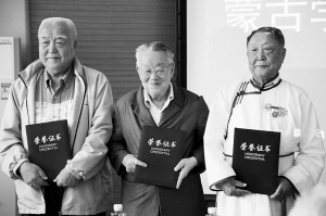 今年9月,内蒙古大学举行“蒙古学研究60年”校友论坛,向创建蒙古语言文学专业的元老确精扎布教授(右一)及历史学专业的元老等颁了发荣誉证书。资料图片