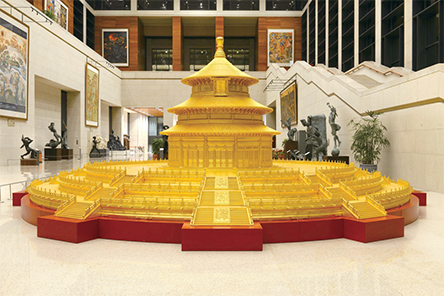 此次入藏国博的这件天坛祈年殿模型,是陈丽华于20世纪90年代聘请赵崇茂、朴学林、王仲杰等故宫老专家多次到现场勘察设计,选用珍贵的缅甸柚木,由几十名高级技术工人耗时三年多纯手工制作的,并在表面手工贴了三层24K99金箔,模型通体金碧辉煌、美轮美奂。模型完全以原建筑物为准,采用中国传统的榫卯结构以1:10的比例精心雕制而成,直径9米,高3.8米,各部件严丝合缝却又能拆装自如,工艺考究、一丝不苟,具有很高的艺术价值和收藏价值。模型再现了祈年殿的古风原貌,可使观众近距离欣赏到中国古建筑艺术和木雕艺术之美,也展现了中国紫檀博物馆在木雕艺术上的造诣传承。