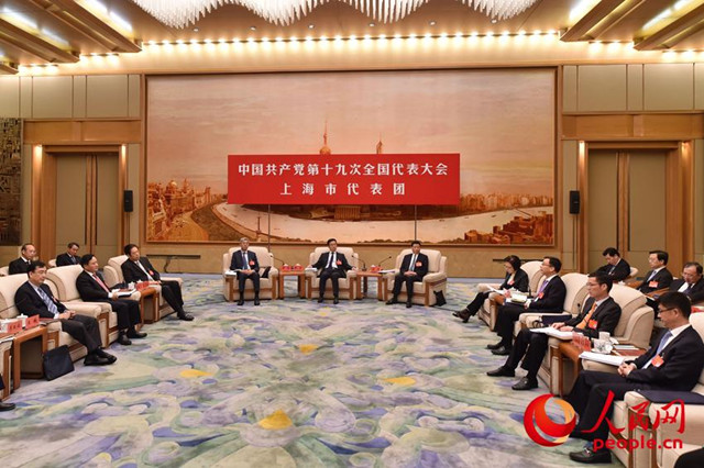 10月19日,出席中国共产党第十九次全国代表大会的上海代表团在北京人民大会堂讨论党的十九大报告,并对中外媒体开放。