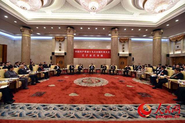 10月19日,出席中国共产党第十九次全国代表大会的辽宁代表团在北京人民大会堂讨论党的十九大报告,并对中外媒体开放。