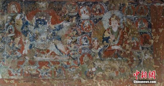 10月26日,从西藏自治区山南市文化局(市文物局)获悉,该单位与湖南省文物考古研究所组成的调查组发现“果拉康”遗址。遗存内壁画保存较完好,研究人员初步推测其形成于14世纪前后,距今约700年。图为遗址中的壁画。 中新社记者 贾英杰 摄