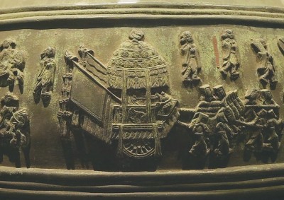 卤簿钟此番在博物馆里是裸展,虽然设了一个矮围栏,但丝毫无碍探身细看,因此每个细节都历历在目,铸在钟上的“千里江山图”也是如此。不过既有《卤簿钟的年代研究》在先,则仍以照引为宜:“卤簿钟身饰纹第四层,凸铸一条横绕钟身一周的山水纹带。这条饰纹带,是由三段相同的画面相连结,构成一幅气势磅礴,山势连绵的山水图卷。就其画面内容,择其一段,则可窥其全貌。画面取景作横卷式,以六座高山前后交错布列,成为整个画面的中心。六座高山分前后两排,形成一条由右向左的狭长山谷,由于前排三山的遮挡,在画面上形成了三个空间:第一个空间,右下角有一行者赶着毛驴,将从溪上小桥走过,沿着前方的夹谷山路而去。在其右边的山谷里,一劳作者似荷锄而归。在其前上方的山脚下,有一茅屋隐约可见。第二个空间,是由左面相连的三山和左面一山相对,中间出现一条斜长的