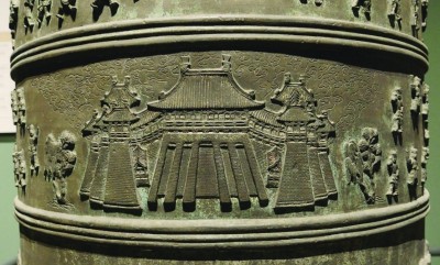 帝王出行的仪物制度即所谓“卤簿”是我留心的问题之一,这一口难得的卤簿钟自然早在关注范围之内。且不说它的铸造工艺精良,纹饰繁复而准确,因成考证仪卫制度的难得实证,遍布于不同装饰带的建筑、山水、四神、四仙,也都引人注目。虽然它的名气似乎不够大,但却不乏注意到卤簿钟重要价值的学者。最是夷考精详的论述,当推王明琦《卤簿钟的年代研究》一文(载《辽海文物考辨》,辽宁大学出版社2000年)。以“年代研究”标题,即因关于卤簿钟的时代,有辽代说,金代说,宋代说,至于钟身的“大清乾隆年造”系后刻,倒是很容易判定,而据此可知它曾入清宫内府。卤簿钟下缘朱雀开光的火焰珠左侧近口沿处,由右向左斜刻一行“右街僧官(押)宛平县仰山院(押)”,《卤簿钟的年代研究》在多方举证考订钟为北宋物之后,认为这一行铭文是“金代检验青铜器物的官员验记刻文”;“所以流入燕京的仰山院,大体上是和辽宁省博物馆藏北宋徽宗时期铸造的‘大晟南吕编钟’流入金代上京一样,在北宋靖康之变,金人破汴梁,掠运到燕京的”。又以“仰山院”之名,可推知验记刻文的年代,约当金代实行铜器验记制度的海陵王正隆二年至金世宗赐名仰山院为栖隐寺之大定二年的五年之间。傅熹年《宋赵佶〈瑞鹤图〉和它所表现出的北宋汴梁宫城正门宣德门》一文,更将钟的制作年代时代锁定在北宋末的政和八年——铸于铜钟第四层装饰带的一座城门,凹字形平面,城楼居中,下开五门,门楼两侧以廊庑与朵楼、两阙相连。而依宋人记载,汴京皇宫的正门为宣德楼,北宋前中期皇宫正门为三个门道,至政和八年方以蔡京倡言,据唐长安大明宫丹凤门之制扩建宣德门为五个门道,即整个北宋“仅仅在最后九年才在汴梁宫殿中建了一座五个门道的城门,其他时间地点均无可能,所以钟上的门楼形象应是扩建后的宣德门”(《傅熹年书画鉴定集》,河南美术出版社1999年)。城楼名称既得以确定,铜钟择要表现的大驾卤簿且以环形而寓出与入之意,自可与祥云蔚缭的宣德门构成完整的叙事,那么其下有类于“千里江山”的一周山水图,也就不是纯然的风景。