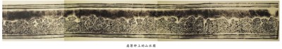 山谷,溪水沿谷底而流。左上方,有一亭式建筑倚立于左三山的山坳之前。右山脚下的溪水边,停泊着一小木舟,景象异常恬静。第三个空间,则是第二个空间左三山向左的延续,在画面最左面的山坳间,亦有两座茅屋隐现。有的茅屋顶上挑着一面小旗,是为酒肆的标志。从整个画面看,近景是峰峦迭嶂,远景则是山势连绵。树木、溪流、小桥、木舟、茅屋、酒肆等点缀其间。”“就卤簿钟饰纹带所表现的山水题材来说,也具有北宋绘画中山水长卷的时代特征。”