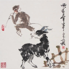 2011年,第四届全国花鸟画展在贵州举办,由南明区文联承办,作为东道主,我受邀参展,本来,我从不画花鸟,但作为任务,只得硬着头皮抵挡一阵。反复思考后,我选择了成语“顺手牵羊”为题,画了一幅立轴。这个题材应该说也是有点来由的,因为我属羊,老伴属猴,我们的结识是在“文革”时期,那时我父亲蹇先艾受到迫害,被定为“资产阶级反动学术权威”被大批大斗,我们一家人都十分落难。我爱人不嫌弃,慧眼识羊,顺手把我牵了过去。可谓有感而发,也就顺理成画了,居然通过了评审,悬于展厅。这一小小的刺激,使我对成语的兴趣倍增。
