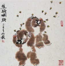 如果只集中画猴,未免有些单调,因此也想画画其它动物,画动物莫过于刘继卣、韩美林,因此,我翻阅了他们的画册,特别是韩美林的动物,生动可爱,笔调简练,不完全写实,加上了一些装饰符号,加之又有童趣,对我的启发很大,但我画的是中国画小品,与他的作品有区别,所以,只学习他取其动物类别之广泛。