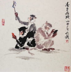 去年,和几个学生一起去广州旅游,看到地铁里的一道风景线,乘坐地铁的人,除了个别老人,其他的不管男、女、大人、小孩都紧握手机,目不转睛,旁若无人,仿佛中了邪似的。无独有偶,打开手机正好发现黄永玉先生的一张漫画“花果山开会” ,一群小猴子,都在玩手机,猴王宣布,开会了,不要玩手机,我便取巧画了一张“各自为政” ,三只猴子,两只在看微信,一只在玩自拍。