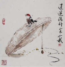 有时候,大自然会无私地恩赐给你美好的创意。记得是一个秋天的下午,我去花溪的阳光水乡画残荷,偶然发现一只青蛙爬到了干枯了的莲蓬顶上,昂首张望,一副“孤芳自赏”的姿态,我赶紧拍了一张照片,便又促成一趣。