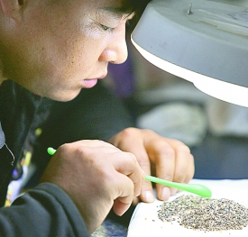 研究人员在对筛选水洗探方土样后残留的微小物质进行挑选。李鹏摄/光明图片