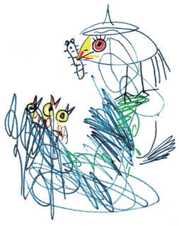 女儿乱涂乱画一通后,在纸上留下了乱麻似的线条,我左看右看也没能找出形的倾向。我只好把这团乱线当鸟巢,加几笔便成了这幅鸟妈妈给鸟宝宝喂食的画。