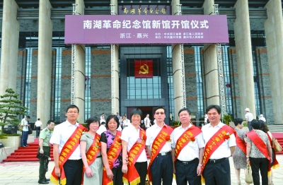 受表彰的先进党员代表在南湖革命纪念馆前合影留念。光明图片/视觉中国