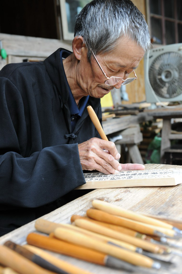 为什么不带徒弟呢?他说,带过几个的,但是牌位雕刻要很细心、很耐心,所以他们坐不牢了,就去打工了。老人粗布蓝衫,身前摆着一个半成品的牌位,他拿着几块木板配件合拢给我们看。桌上还有一堆大大小小的刻刀,刀锋尖方圆扁形态各异。他说,这些刀具都是他自己制作的。细读他淡淡的表情,似有自豪,也有失落。再过20年,还有谁将拿起这些刻刀?