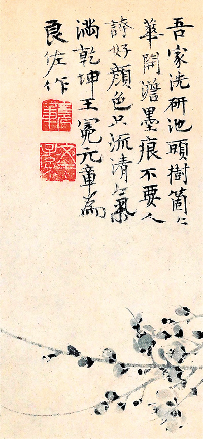 王冕画上的原诗是:“吾家洗砚池头树,个个花开淡墨痕。不要人夸好颜色,只流清气满乾坤。”这幅画和这首诗后人多有引用和赞美,几乎每句文字都有不同版本,多写做:“我家洗砚池边树,朵朵花开淡墨痕。不要人夸好颜色,只留清气满乾坤。”(清·钱谦益编《列朝诗集·甲集·前编第五》)王冕赞美墨梅不求人夸,只愿给人间留下清香的美德,借梅自喻,表达自己“穷且益坚,不坠青云之志”的高洁品质。