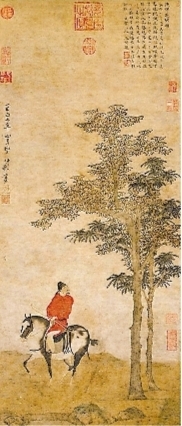《人骑图》中的“骑”字是由“马”和“奇”组成的会意字,“奇”字古义为“异”和“大”,作为量词与“偶”相反,而“偶”就是俗的意思,《后汉书·独行列传》中对独行之士的描绘就为历代文人推崇。远古时期的马也是以多数出现,或是被组成骑兵团参战,或是作为天子贵族出行的马车,孔颖达《左传正义》说至六国时始有单骑。所以,不同凡俗之人才能骑马独行,“千里走单骑”的关羽就是一例。赵孟頫把自己画成唐代骑马的独行之士,正是一种内心独白:因为秉持道义,所以具有一意孤行的勇气。