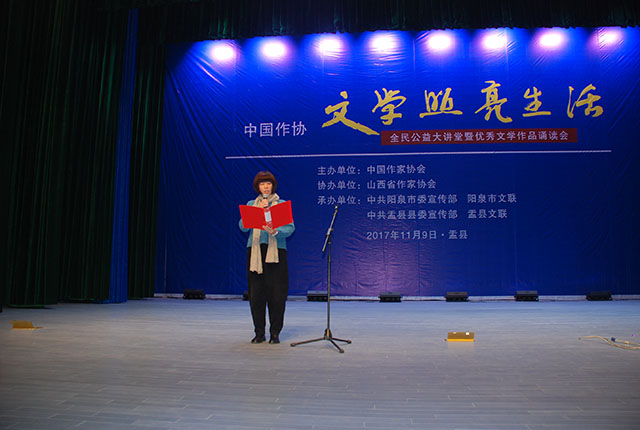 11月9日,中国作协“文学照亮生活”全民公益大讲堂暨优秀文学作品诵读会第九讲在山西省阳泉市盂县举行。著名作家叶广芩为600多名基层作家、文学爱好者做了题为《走进历史的皱褶》的讲座。活动由山西省作协党组副书记、副主席张锐锋主持,阳泉市委宣传部副部长刘瑞平、阳泉市文联主席侯讵望、盂县县委副书记李宏革、宣传部长王浩等参加活动。