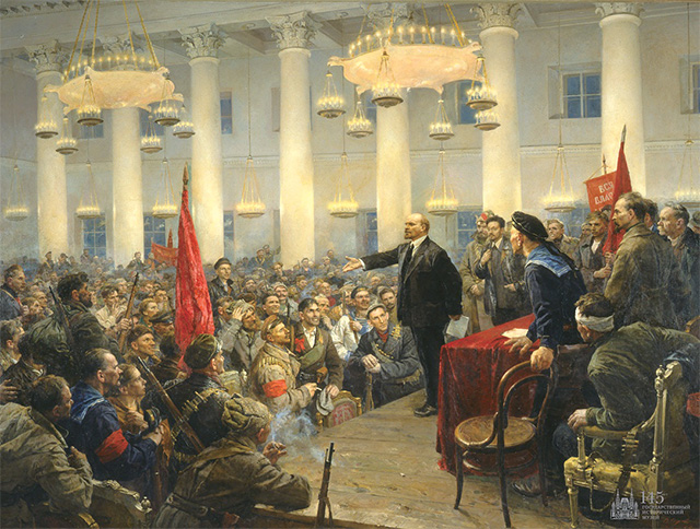 第一部分“伟大的革命”,展示了“阿芙乐尔”号巡洋舰舷窗、“十月革命万岁”旗帜等珍贵文物和20余张描绘十月革命等重大事件的油画作品,包括勃罗茨基的《1917年5月列宁在普基洛夫工厂工人大会演讲》、谢洛夫的《列宁在全俄苏维埃第二次代表大会上讲话》、格拉西莫夫的《列宁在讲坛上》、索科洛夫-斯卡利亚创作的《向冬宫突击》等经典历史题材绘画作品。此外,本部分还展出了一系列照片和明信片,它们可谓1917年2月至10月彼得格勒和莫斯科这两个俄罗斯主要城市的一份独特的大事记。