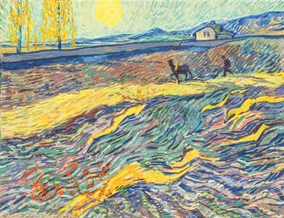 这幅作品是文森特·梵高在圣雷米疗养院时创作,次年便与世长辞。当时他住在圣雷米的疗养院,透过病房的窗户就能看到这片景色。《田野里犁地的农夫》是梵高放下画笔很久之后的又一幅作品,当时疗养院的人已经把梵高的工作室给封锁,等待他恢复健康和稳定的精神状态。