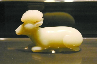 玉器中有一件青白玉夔凤纹子刚款樽,以新疆和田青白玉所制,杯盖雕了虎、狮子和辟邪,杯底有三只兽面足,杯扳有象鼻装饰,扳下刻有“子刚”二字。虽然清代刻有“子刚”款的玉器很多,但真正由玉雕大师陆子刚所制的玉器不多,故此玉樽的价值十分高。玉器中还有一件宋代的青玉卧鹿,同样以和田玉雕成,鹿成跪卧状,姿态优雅,十分的小巧可爱。