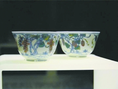 陪葬品虽然不多,但都是精品,其中包括多件明代的斗彩瓷器,如明成化斗彩葡萄纹杯两件。这两只小杯外壁绘有葡萄、桑椹等图案,色彩浓淡得宜,外底写有“大明成化年制”的楷书款。又如明嘉靖的斗彩折枝花卉八卦纹三足炉,三足炉仿成化斗彩,炉上部绘有八卦图案,下部绘折枝莲花纹。这些瓷器在现代价值甚高,即使放在当时也是价值不菲的奢侈品。
