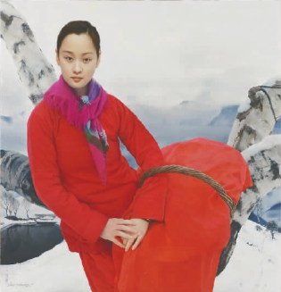 西藏独特的山水、人物是画家们画此不疲的题材,同样让中国画家们孜孜追求的还有农村题材。王沂东的作品《坝上春意》取材于沂蒙山区的风土人情,大雪压枝低的冬季里,河坝边显现出一位身着大红袄的姑娘,萧瑟的冬季里乍现的大红色恰如即将到来的春天带给人的温暖之意。“在构图时我让树干、姑娘和篮筐形成了大‘V’字形,然而为了不使画面构图过于简单,我将画面右边的枝干做了弯曲处理,破了一下画面的纯‘V’字形。 ”王沂东说。写实绘画与观念艺术存在着天然的不可比性,它自有一套独立的语言系统,不单单只是客观地再现,在严格的造型基础上,更需要对轮廓线的处理、结构的认知与强化、空间与解剖的结合、色层与色彩配合、笔触肌理与质感的烘托等等有着精准的把握。“姑娘脖子上的围巾,中间那一角的蓝色是我刻意加上去的,原来并不是这样,因为在大片的红色中需要这样一个颜色来进行对比,对整幅画来说也是点睛之处。 ”在他笔下,沂蒙山区的一情一景、一人一物看似简洁,简洁中却蕴藏着丰富的审美构思与艺术底蕴。