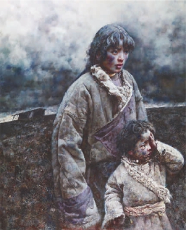 “新中国的第一代画家是徐悲鸿、刘海粟等一批出国学习的画家,后来还有靳尚谊、艾中信等一批画家,之后就是我们这一代人。我们赶上改革开放,可以去世界各地看国外的博物馆,受到不同文化艺术的影响。我们虽然形成了多样化的风格,但是高技术含量、高水准、高难度,仍是写实画派坚持的标准。 ”作为新中国第三代画家的艾轩站在自己的画作《远方的雷声》前说。画作中,大面积颜色暗沉的背景与人物脸上的苍白形成鲜明对比,藏族小男孩捂住一只眼睛、露出的另一只眼睛里充满惶恐而又好奇的神态被刻画得极尽细致。两个人物位于画作前景中,身后的天空和草地都是一抹暗沉,艾轩以借人、借景为依托,巧妙地把孤寂的诗人一般的抒情与神秘感结合在一起。在乡土写实主义的画家群中,走出了一条独特之路,使得他的画作充满了生命力。