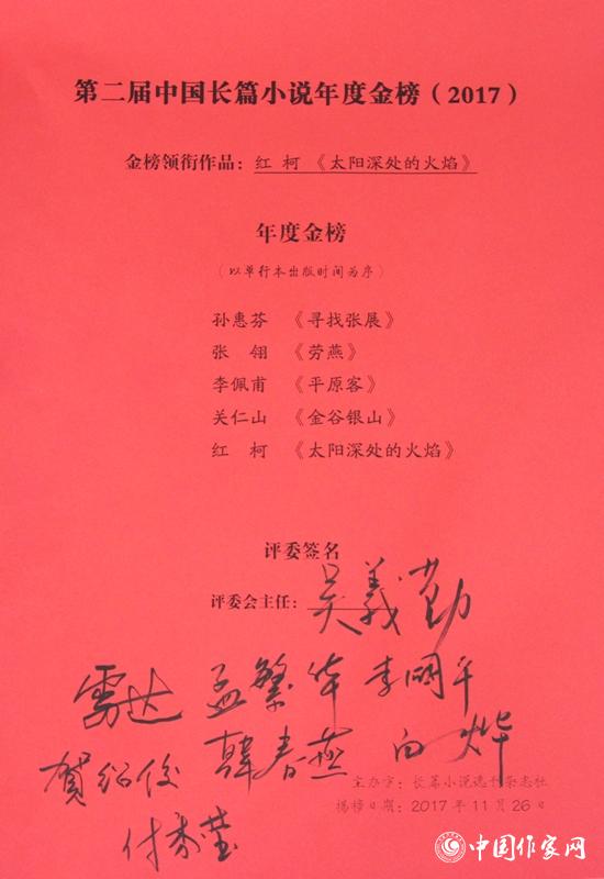 11月26日上午,由长篇小说选刊杂志社举办的第二届中国长篇小说年度金榜(2017)举行了终评活动。15部初评阶段入围的本年度优秀长篇小说,在历时半个月的读者网络投票之后,由专家评委团现场进行终评投票,最终决出了本年度5部金榜作品。孙惠芬的《寻找张展》、张翎的《劳燕》、李佩甫的《平原客》、关仁山的《金谷银山》、红柯的《太阳深处的火焰》五部作品榜上有名。其中,《太阳深处的火焰》荣获金榜领衔作品。